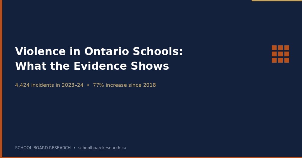 Violence in Ontario’s publicly funded schools has risen by 77% since 2018–19, according to data obtained by Global News through Freedom of Information requests to the Ministry of Education.[1] In the 2023–24 school year — the most recent year available — 4,424 violent incidents were reported, up from 2,499 in 2018–19.[1] And as investigators from the Hold Schools Accountable Parent Network have documented, the true number is almost certainly higher, given the patterns of underreporting and minimization that characterize how many boards handle serious incidents.